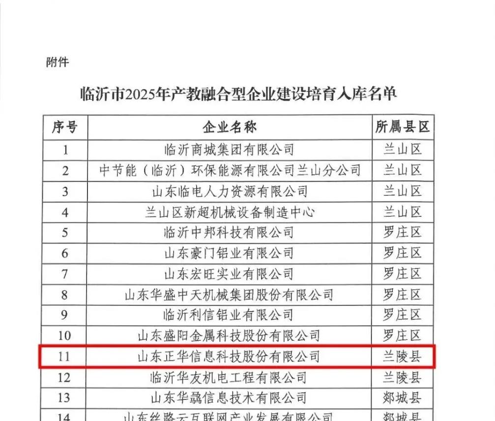 关于公布《临沂市2025年产教融合型企业建设培育人库名单》的通知: 其中兰陵两家企业入围, 山东正华荣誉上榜。